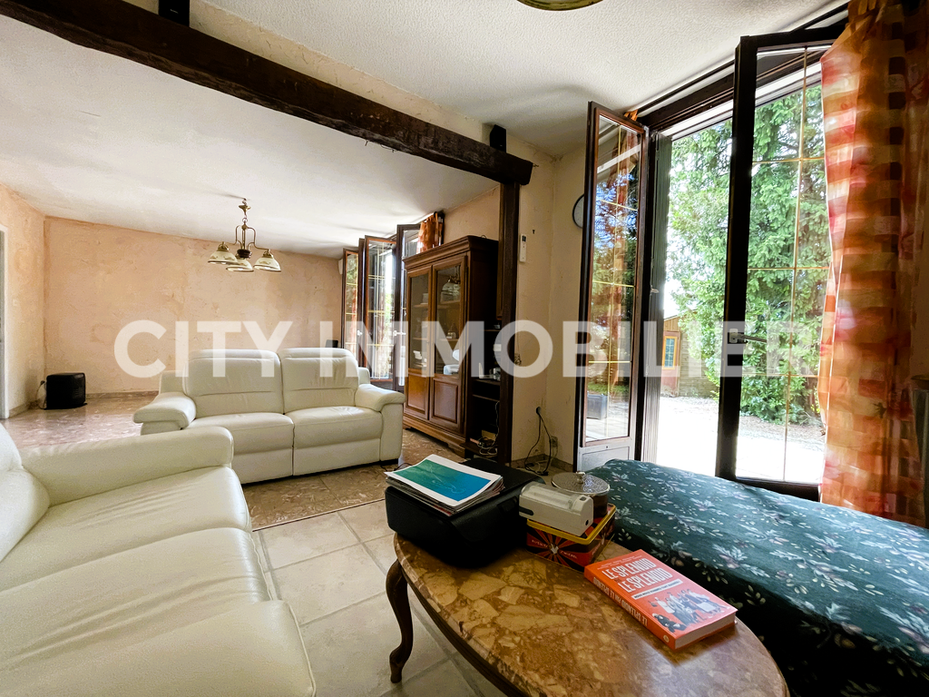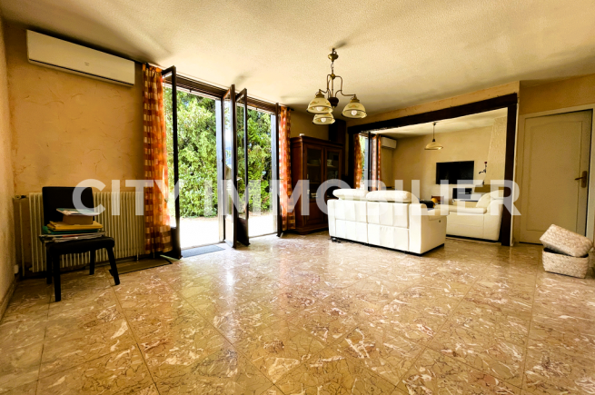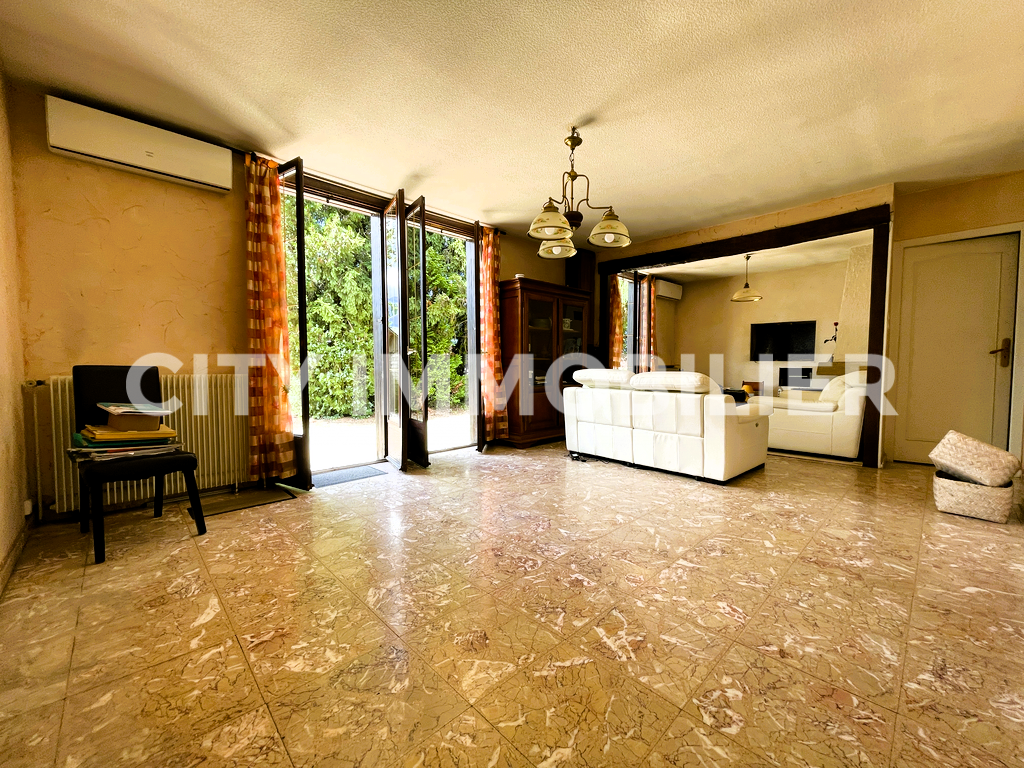 Idéalement située en position dominante et à proximité immédiate de toutes les commodités, villa en partie climatisée ouvrant sur un terrain clos de 1717m² sans vis-à-vis. Quatre chambres dont une au rez-de-chaussée. Prévoir quelques travaux d'aménagement.